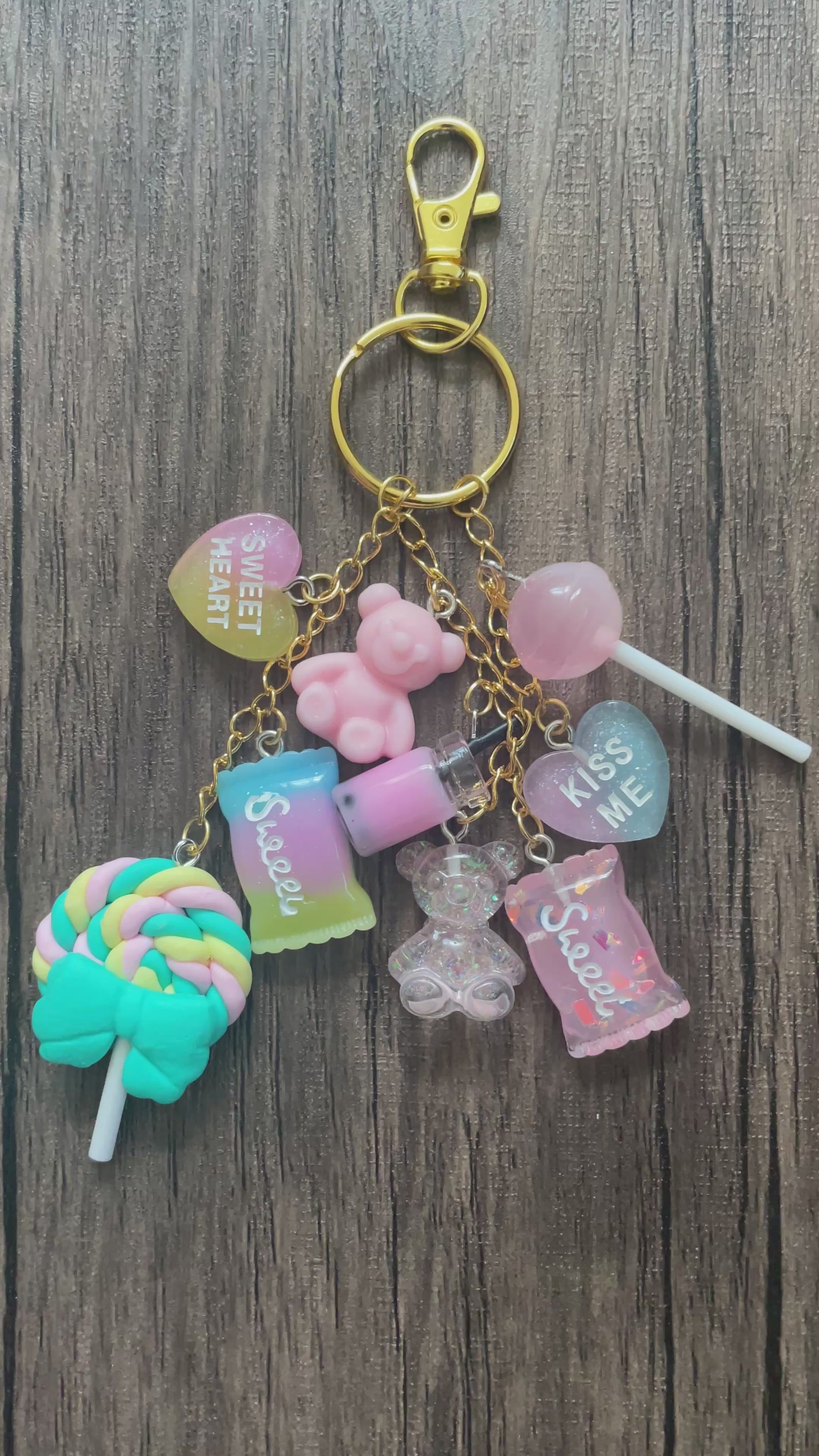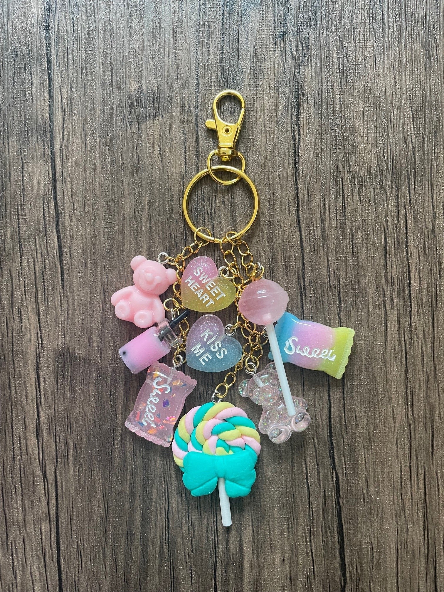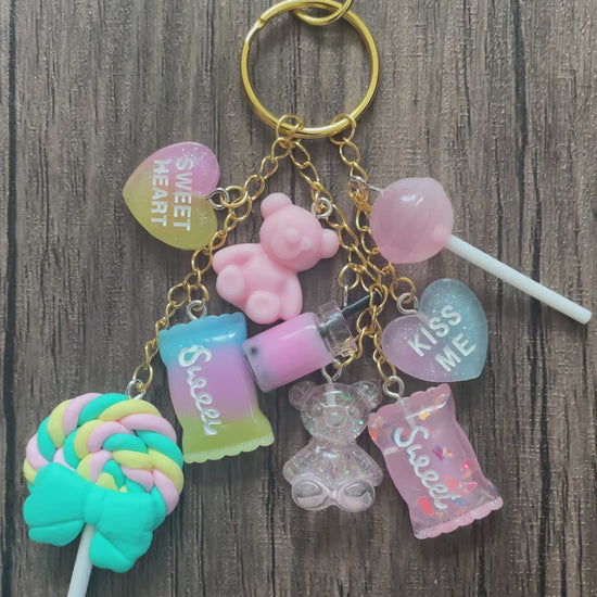 Love Candy Light Pink and Blue Bear, Lollipop, and Hearts Gold Bag Charm