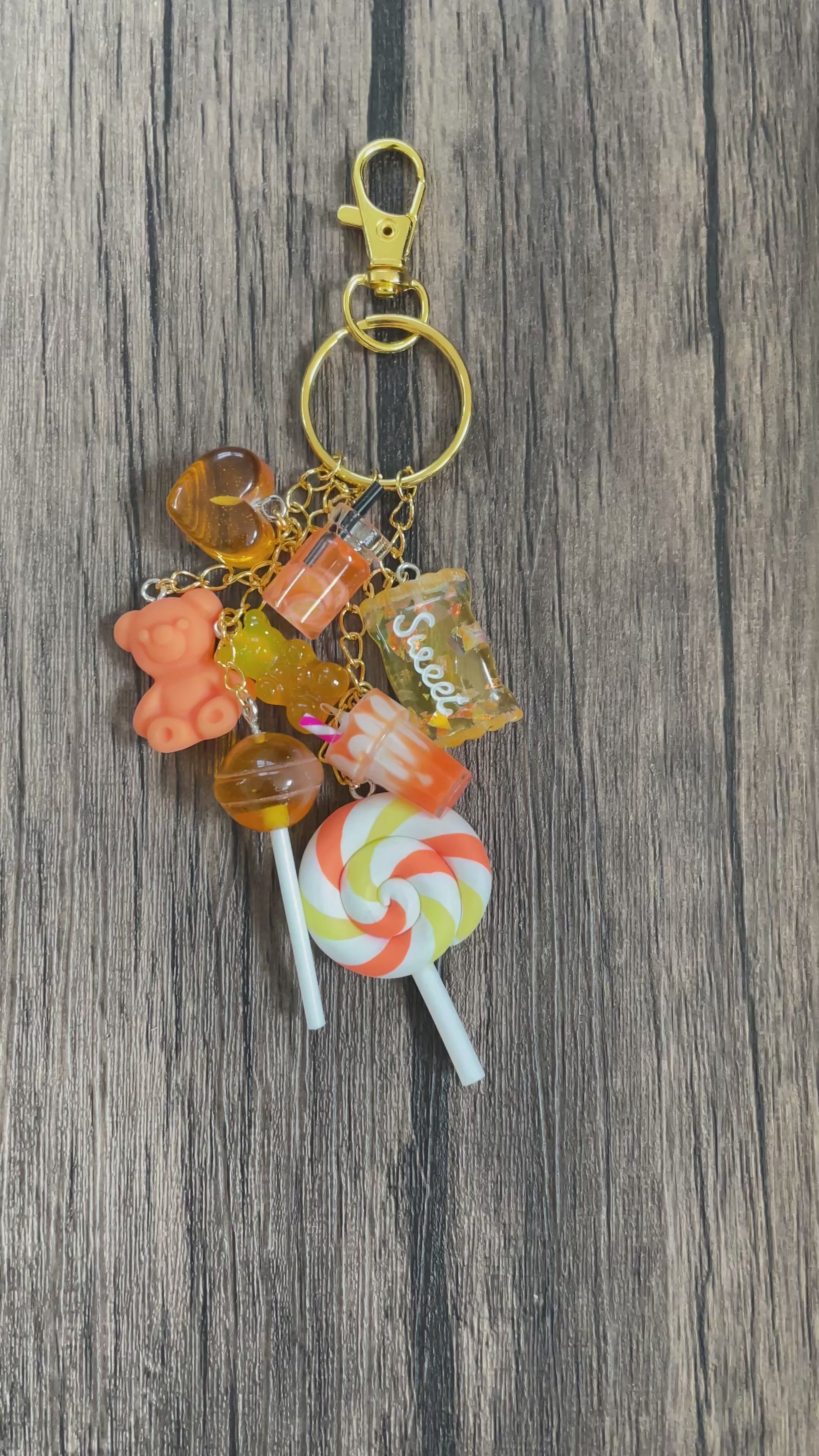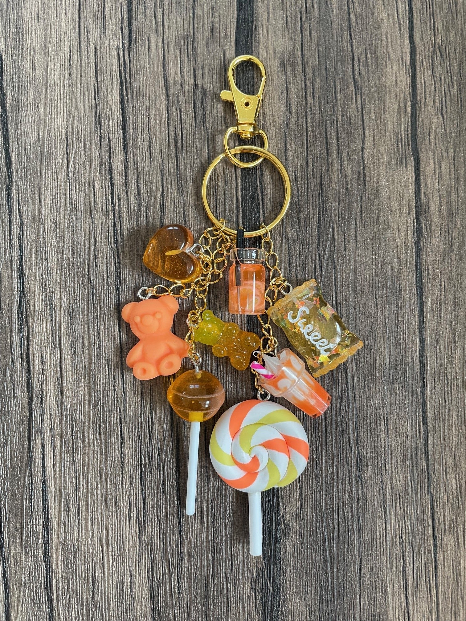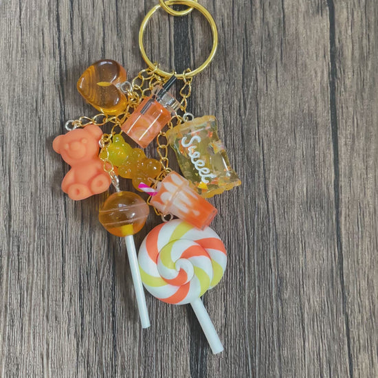 Love Candy Orange Milkshake, Gummy Bear, Lollipop, and Hearts Gold Bag Charm